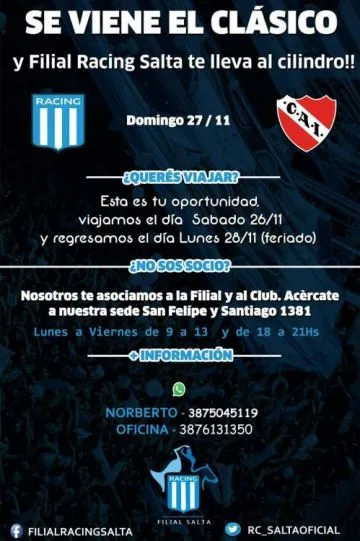 La filial de Racing en Salta te invita a viajar a ver el clásico contra Independiente